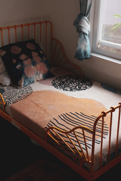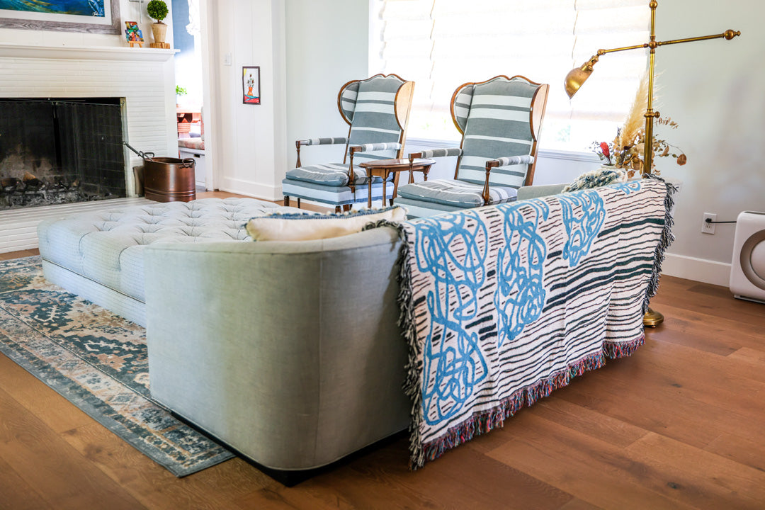 Each textile is individually woven with a jacquard weaving loom, that utilizes only six natural dyed yarn colors to overlap and weave into one another creating the final design.