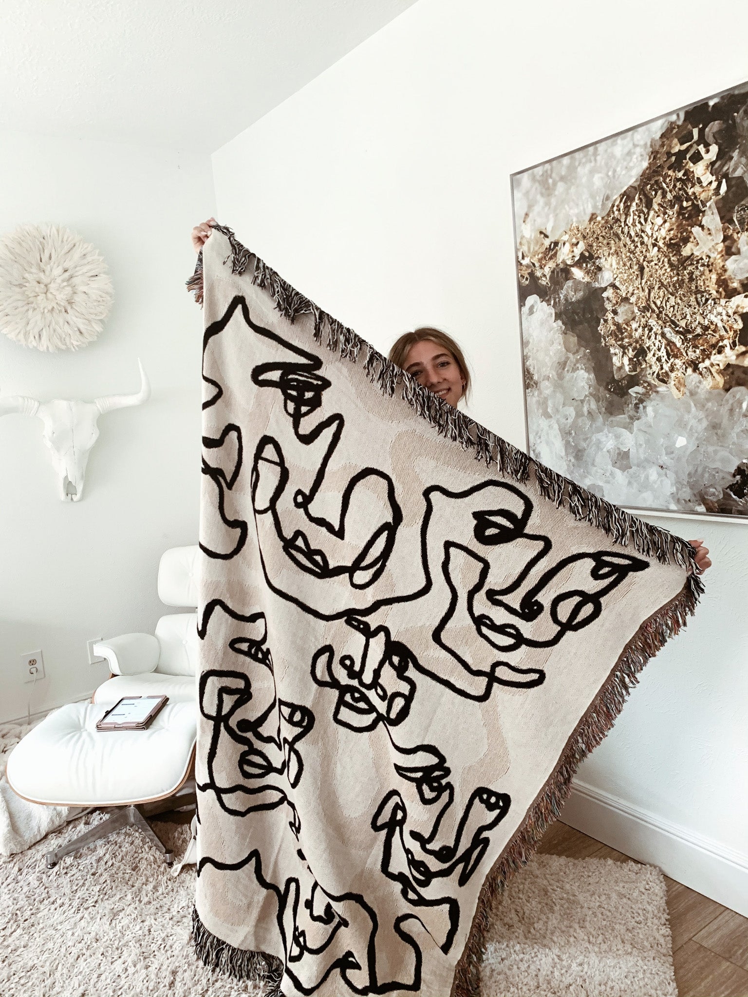 Our 100% cotton jacquard woven throw blankets are crafted with care, combining art and functionality. Each design starts as an original hand-painted piece by Parker Heath, transformed into a durable and versatile blanket. Perfect for cozying up on the couch, adding texture to your bed, or even as a wall tapestry, these blankets are as functional as they are beautiful. Proudly made in collaboration with a trusted USA manufacturer, every blanket reflects Parker’s commitment to quality and artistry.